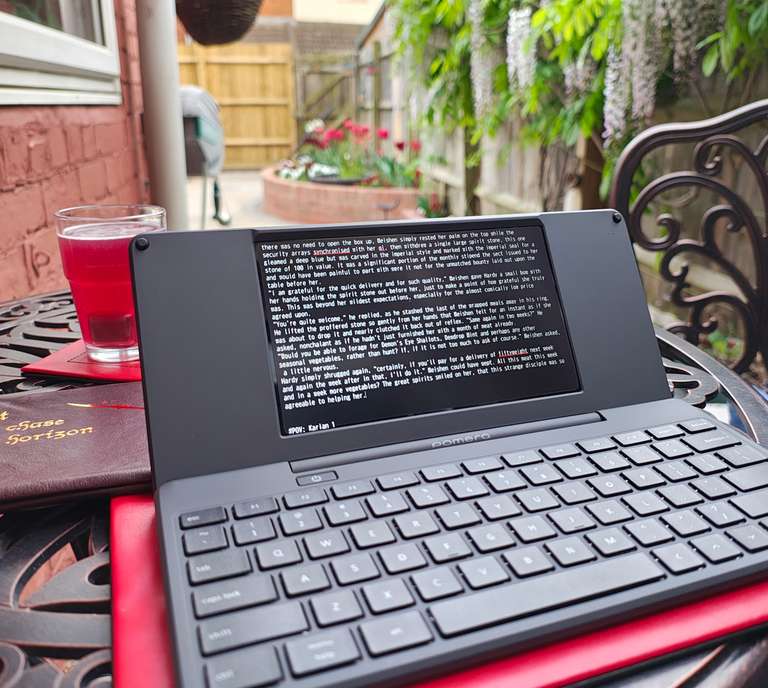 I really get more out of being able to go sit wherever I want and just, you know, get to it. A relatively quiet but quite tactile keyboard for a small chiclet-key thing, a good screen with white-black and black-white plus brightness options (oh, this baby is fully lit for night time typing if you want :p ), solid af battery life and enough memory to eat hundreds of thousands of words across scores of files. I just decide I want to write, open the lid, wait like 3 seconds and I'm back to where I left off in my last file. Amazing.