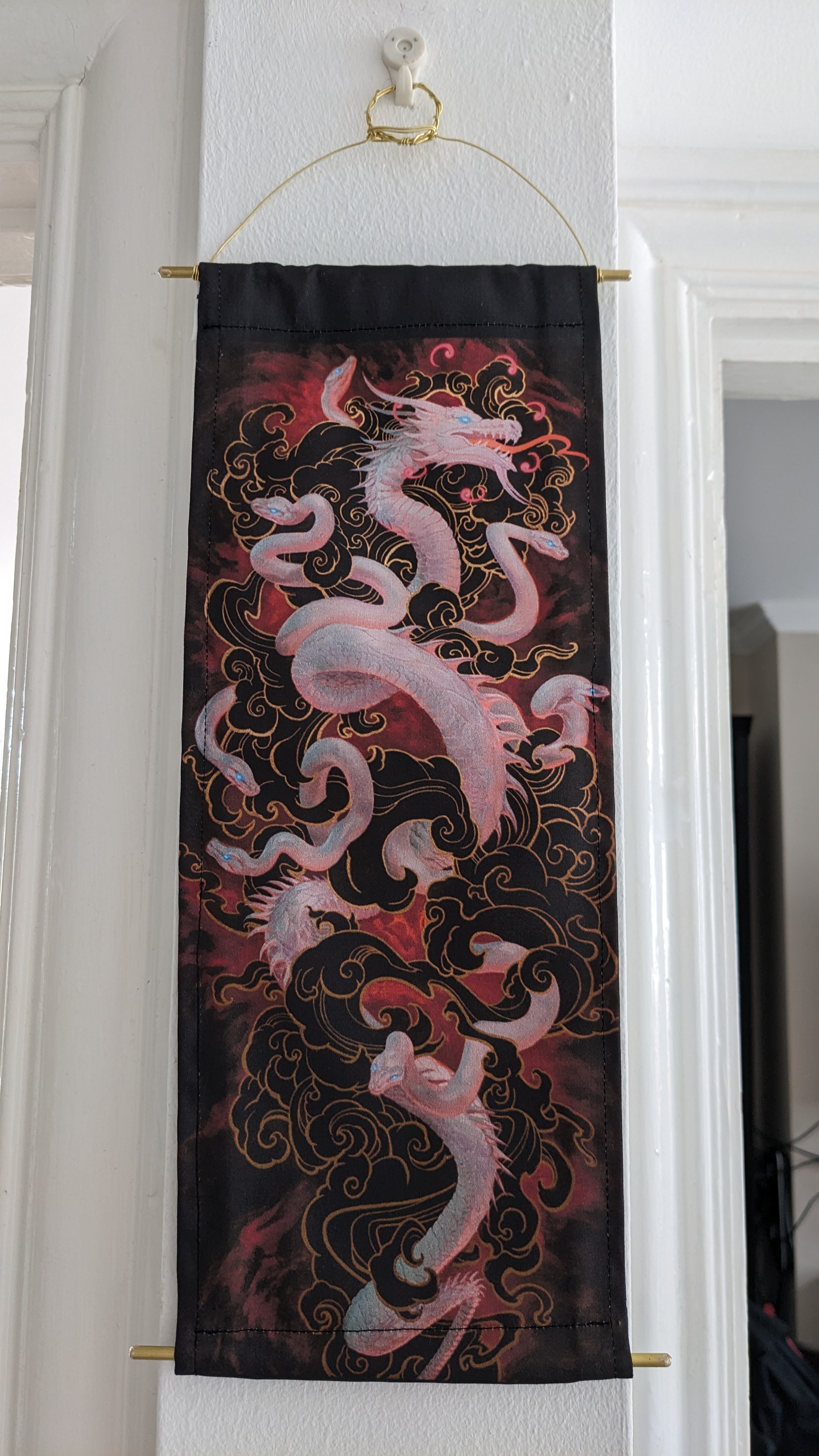 The first hanging is just the panel itself, with a backing piece of linen, sewn to have a rolled end top and bottom to hold the hanging bar.