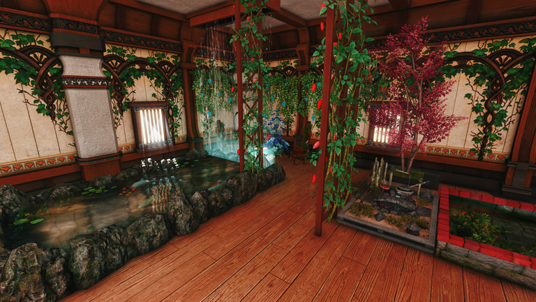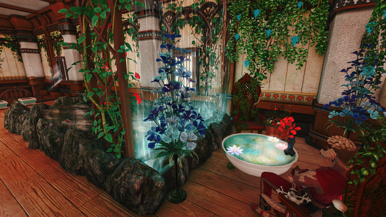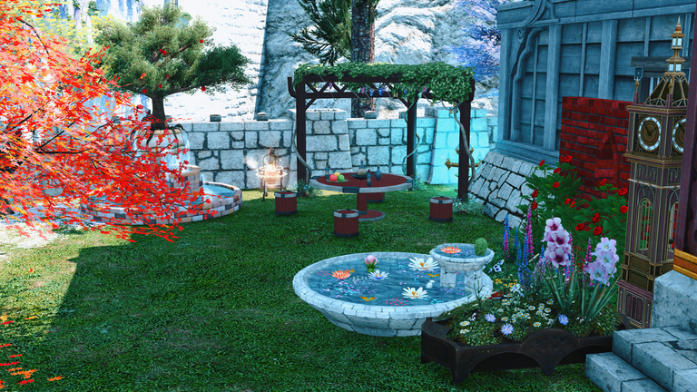 The garden is mostly a re-jigging of the garden used at the previous small plot (the one opposite this, actually) with a few additions (that faerie fountain is new, and I love it - it lights up at night!) and some old items dragged out of storage now that there's a whole 30 item decoration limit!