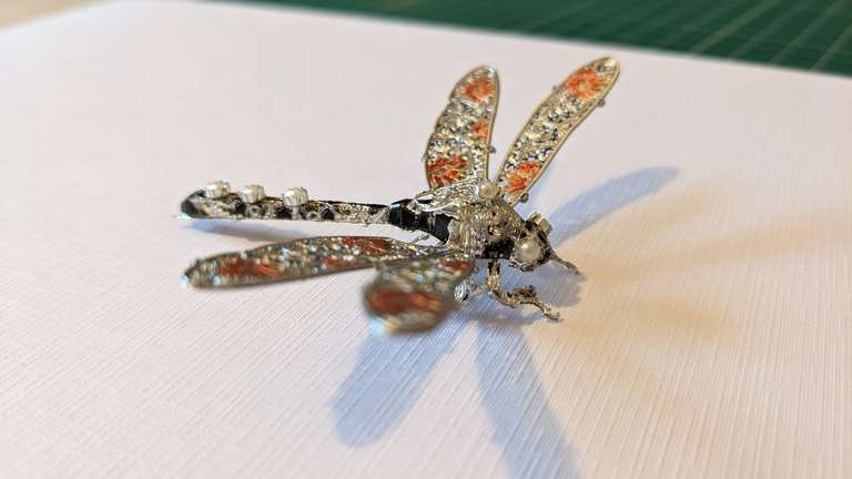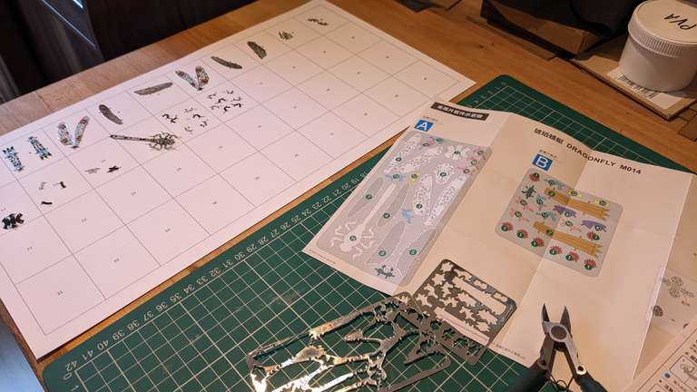 This particular dragonfly is tiny though. It's 6cm with an 8.5cm wingspan. The Gemsect kits are some of the smallest in terms of number of pieces and overall simplicity of build - the number of curved parts does add back to the complexity in its own way though so there's still some challenge. There were just under twenty different types of piece, all snipped out of one and a half sheets that were, well, not much bigger than a credit card.