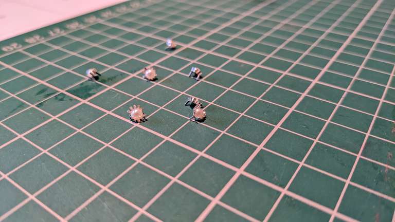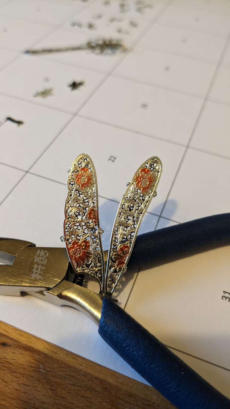 I tell you, some of those pieces were tiny as hell, I gave up on bending the settings around the 'pearl' gems - I glued them in and bent the settings around them after! Too tiny to do it any other way, even using dainty little craft tweezers to hold them, getting a good grip on the gem and setting and also being able to get a good angle to pliers the setting into place properly was hard.
