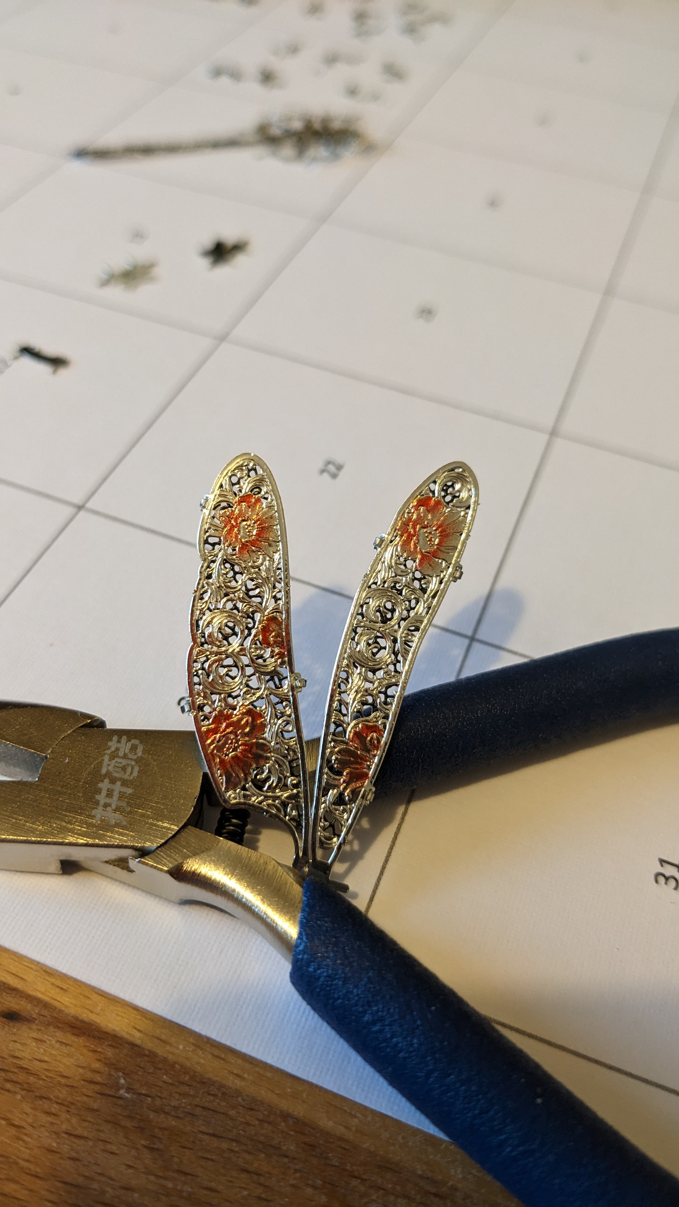 I tell you, some of those pieces were tiny as hell, I gave up on bending the settings around the 'pearl' gems - I glued them in and bent the settings around them after! Too tiny to do it any other way, even using dainty little craft tweezers to hold them, getting a good grip on the gem and setting and also being able to get a good angle to pliers the setting into place properly was hard.