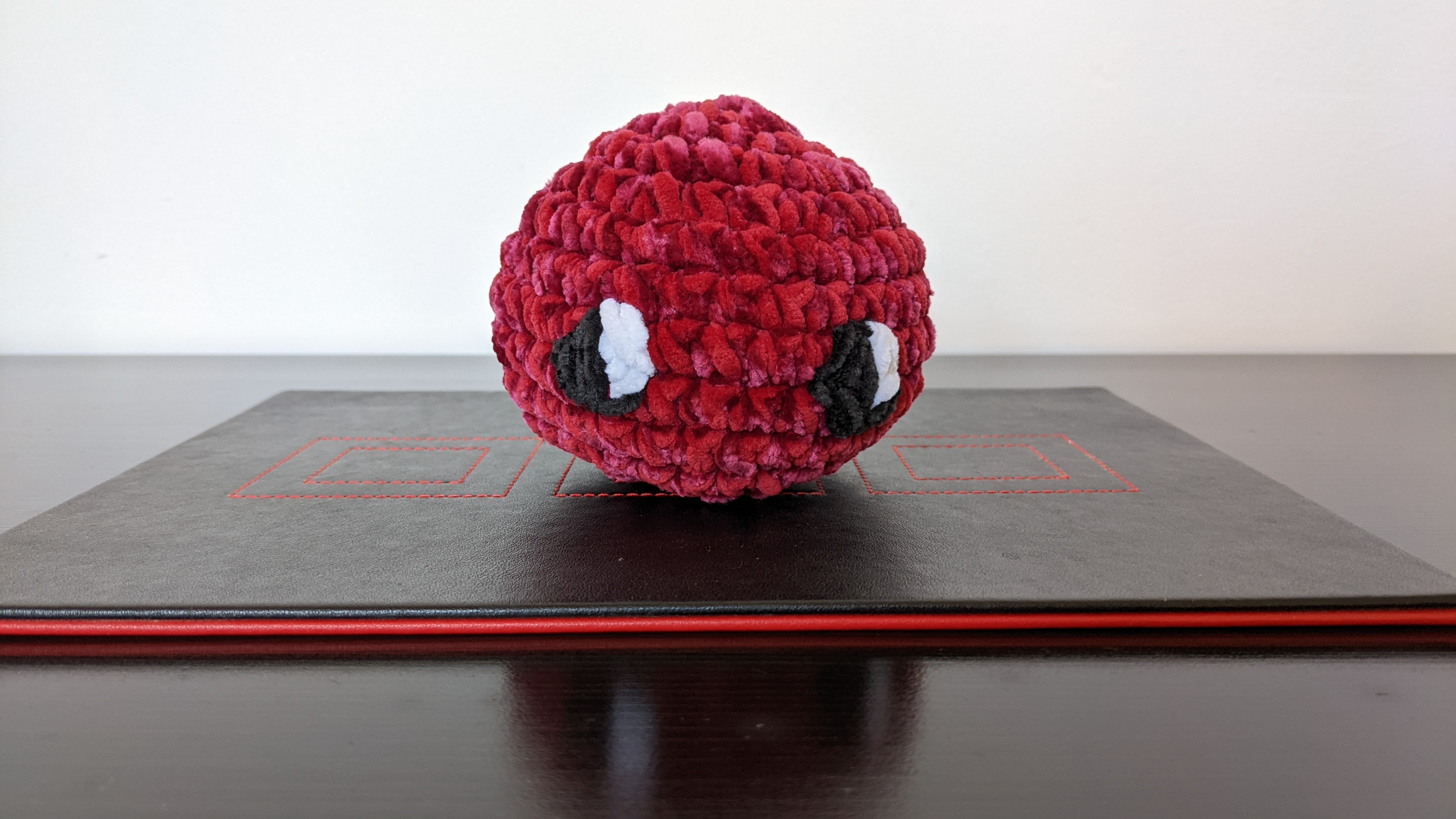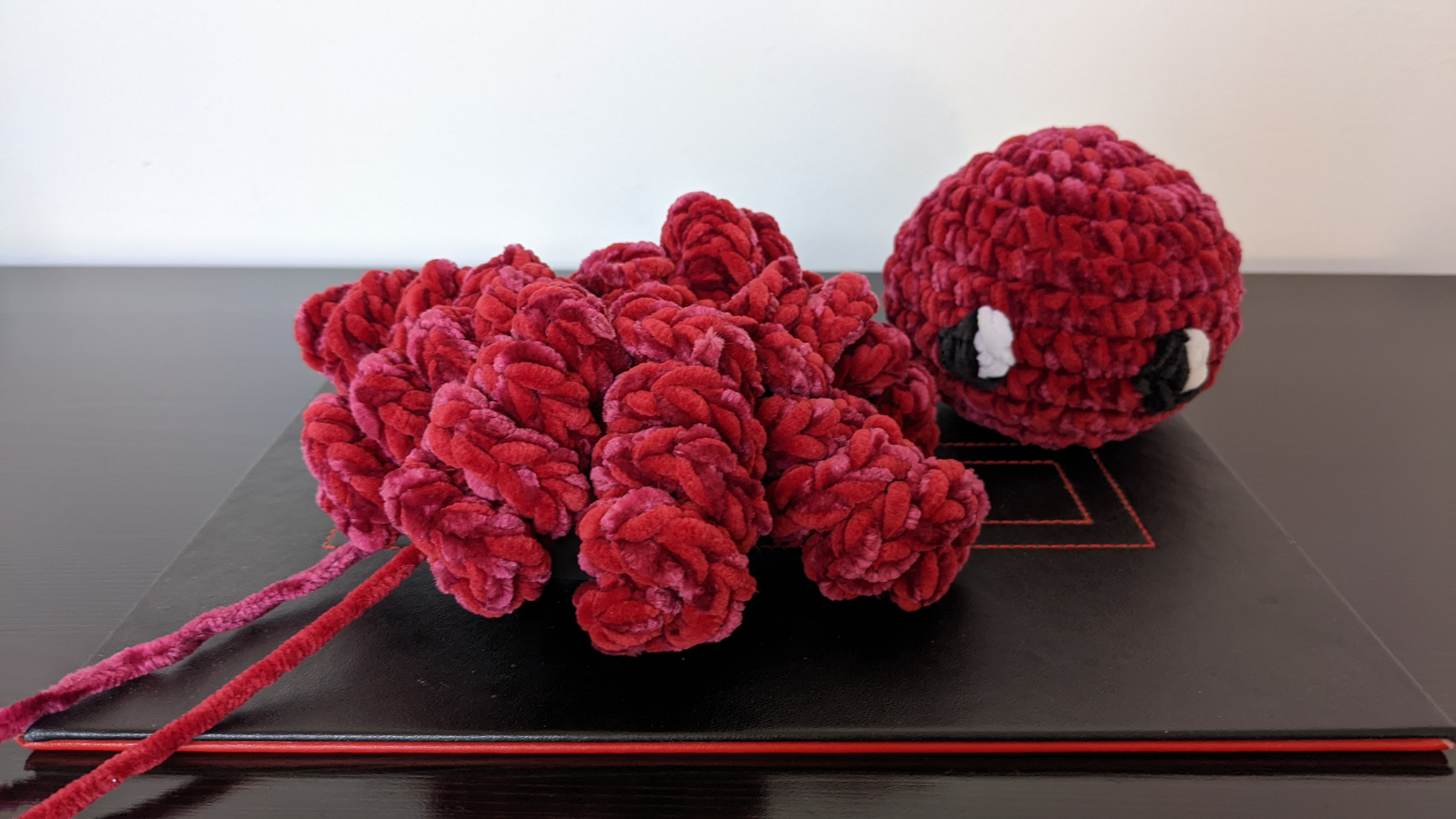 Adorable and also super soft and squishy! The head is a little larger than your average stress ball and because I used a chenille yarn (red) with a velvet yarn (deep pink), it's seriously soft and just very tactile. Even the eyes are stitched on using a small velvet yarn (Sirdar's little amigurumi velvet-type, in case you wanted to know).