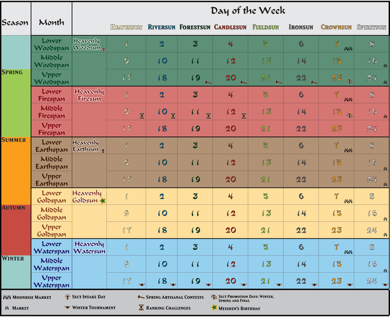 The Sect of the Deepest Earth lives according to a calendar where the year begins on Heavenly Earthsun, the most earth-aspected day of the year and the day when new disciples are accepted. This is their major annual event when they gain new blood and shed the weight and wear of the year gone to refresh and reinvigorate the sect before a new year's efforts and growth. There are plenty of other days of note, of course, but Heavenly Earthsun and the other ones marked on the calendar above are the big ones that even a first-realm outer disciple would be affected by.