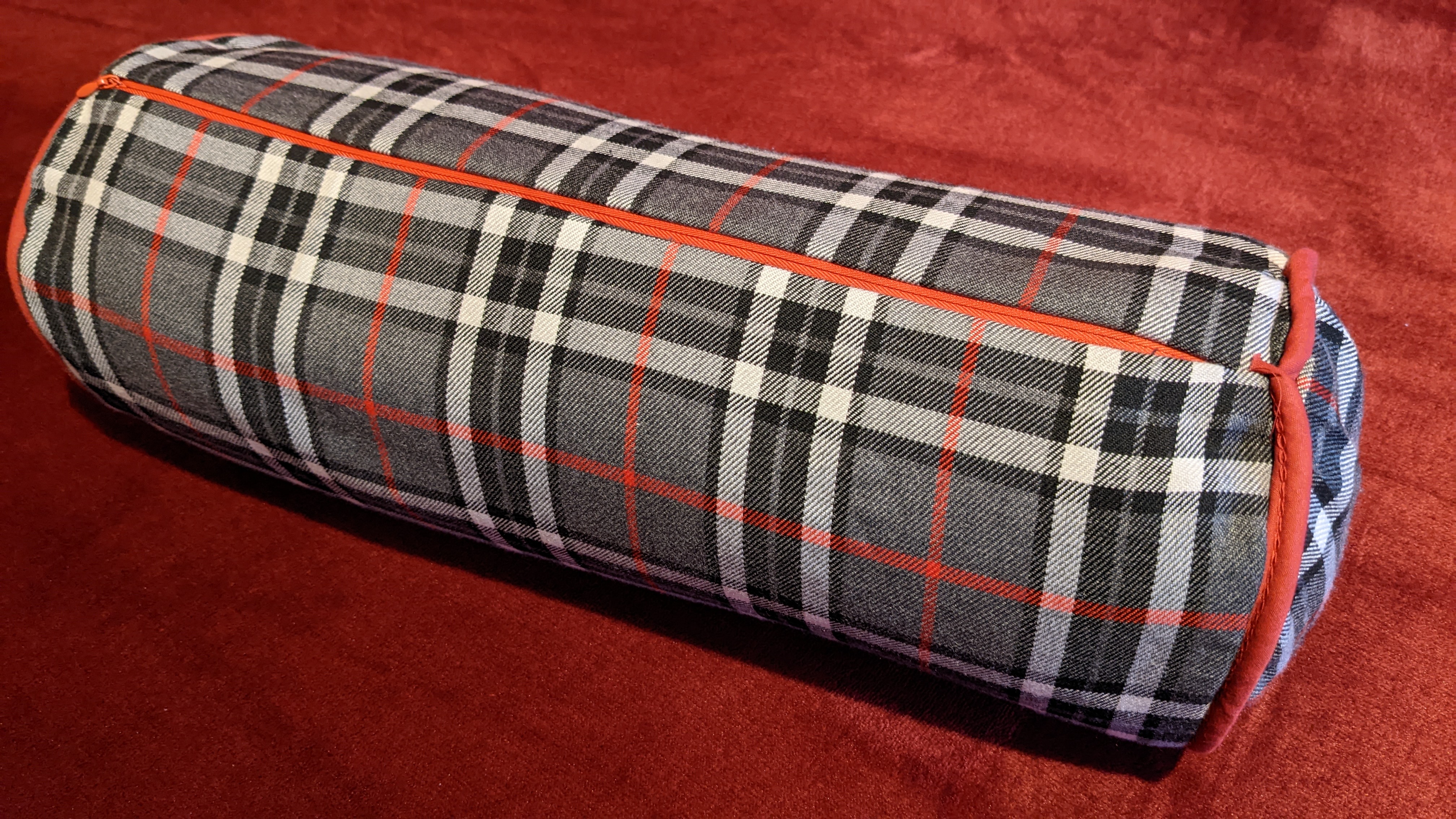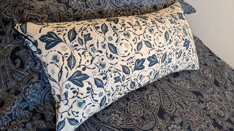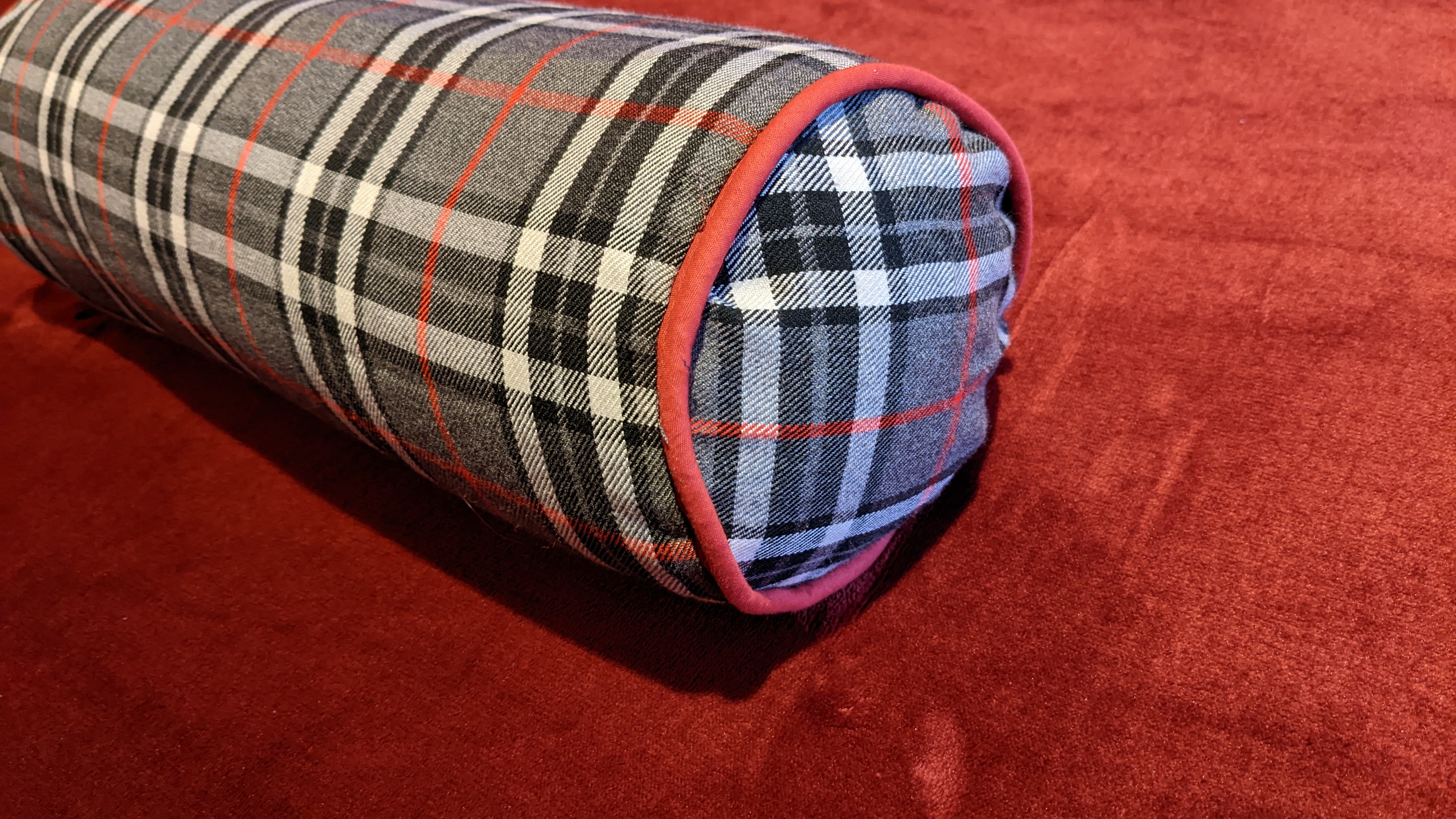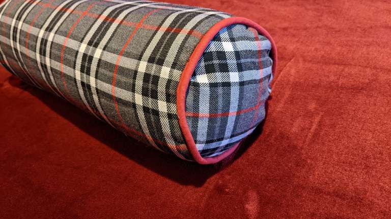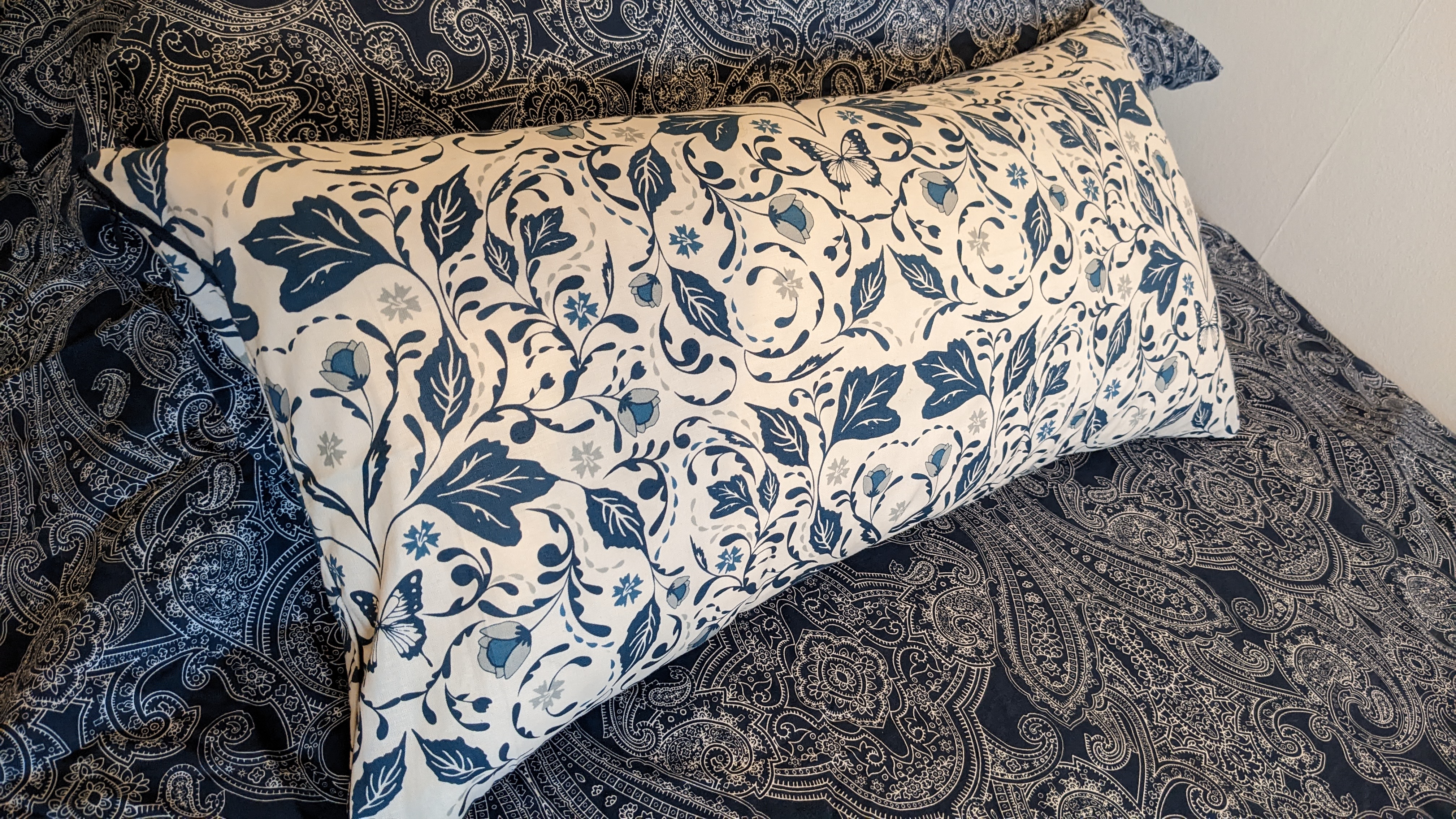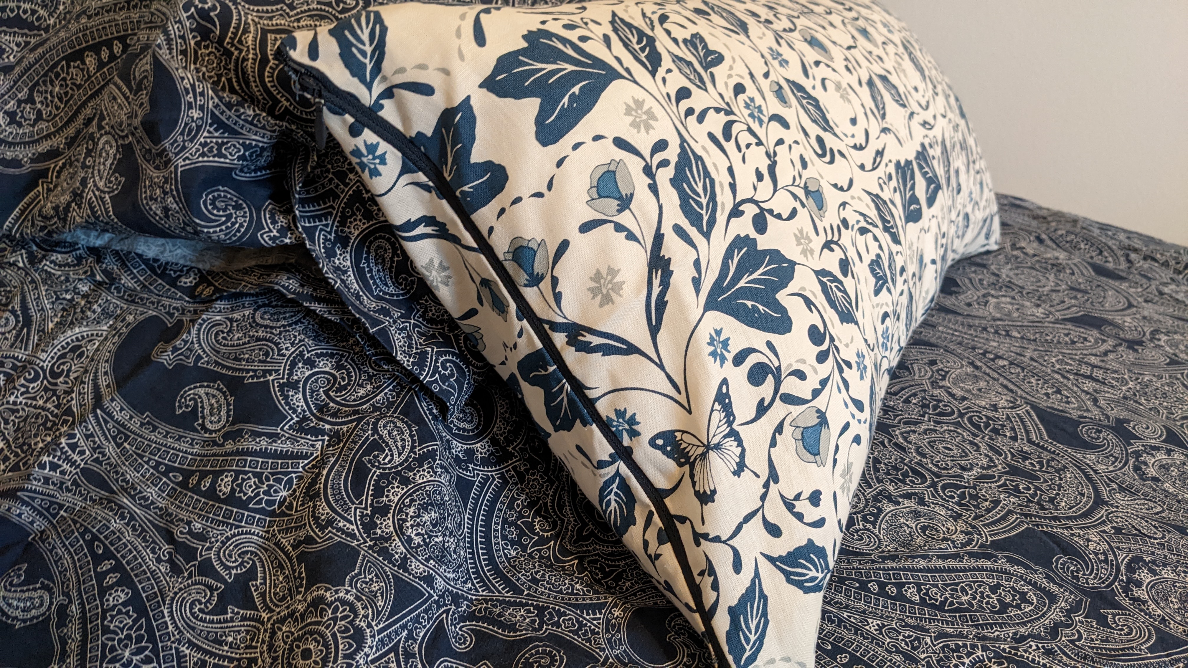 Then made a cushion cover that's been waiting for me to find the time for months. That's now looking pretty on the guest bed. Emboldened by this success, I moved on to the small bolster cushion that needed a cover for my room, and I even threw in a quid's worth of basic piping from Hobbycraft.