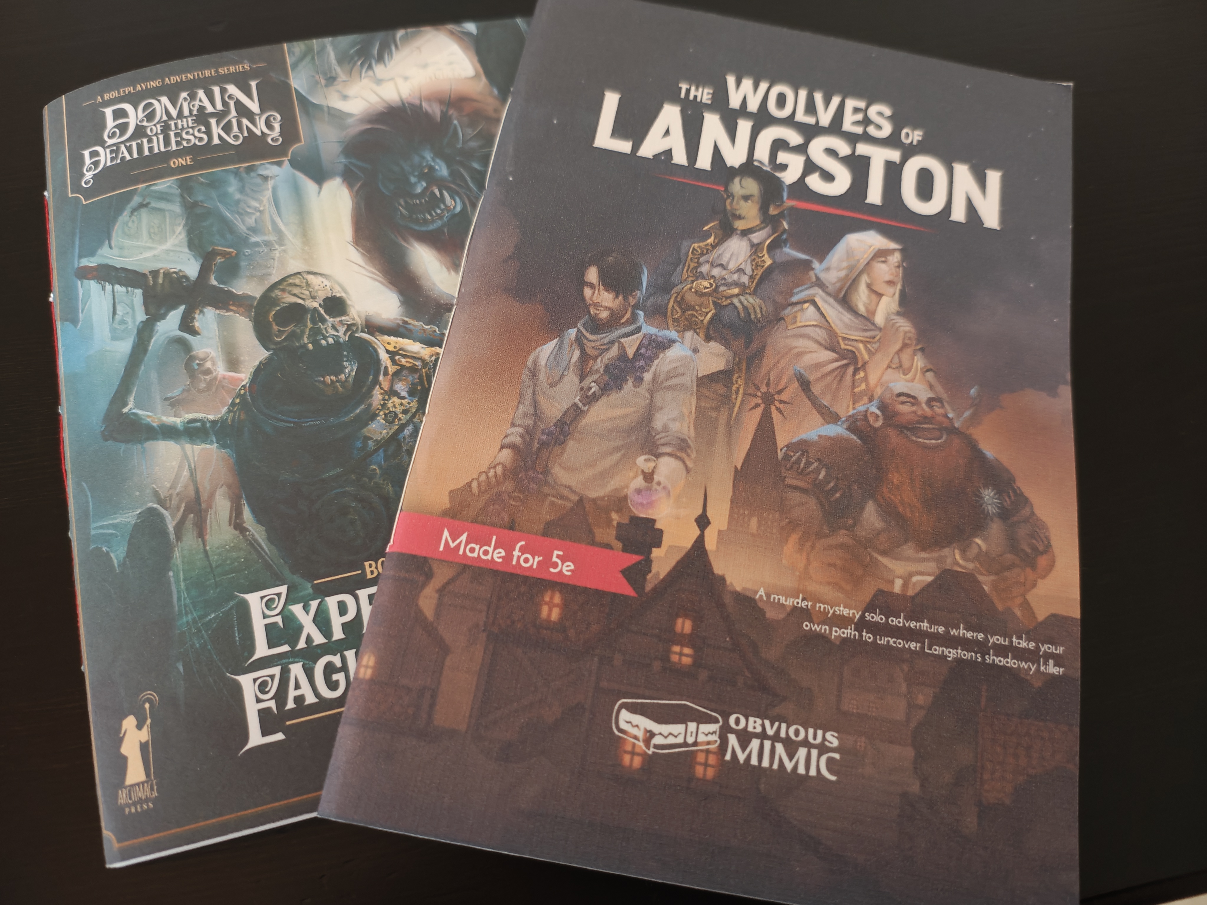 I mentioned previously I'd been playing Domain of the Deathless King vol. 1, I've also got all three of Obvious Mimic's solo adventures (although those don't include NPC party members and battlemap combat) for D&D 5e - or 5.5e in my case.
